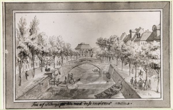 etsning; akvarell; dag; sommar; exteriör; arkitektur; bro; kanal; eka; man; kvinna