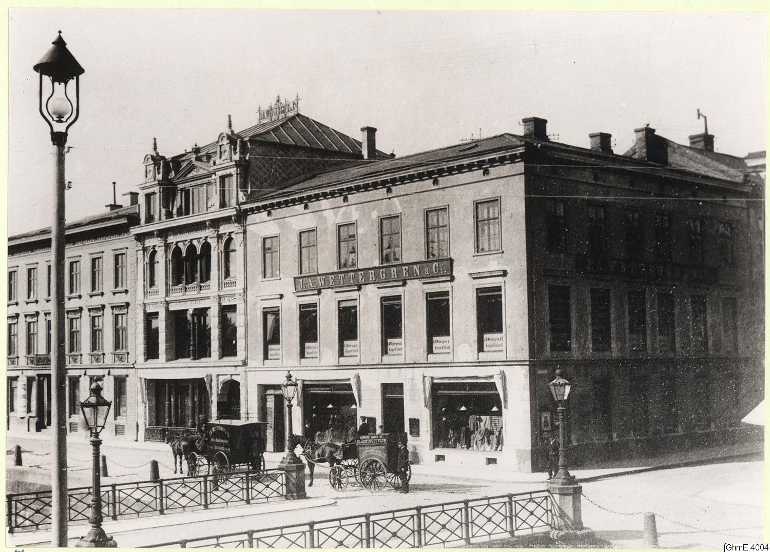 - Östra Hamngatan 41, 43 och 45, från höger till vänster. Nummer 41 och 43 var från 1850-talet i J A Wettergrens ägo och inrymde manufaktur- och kappaffär.