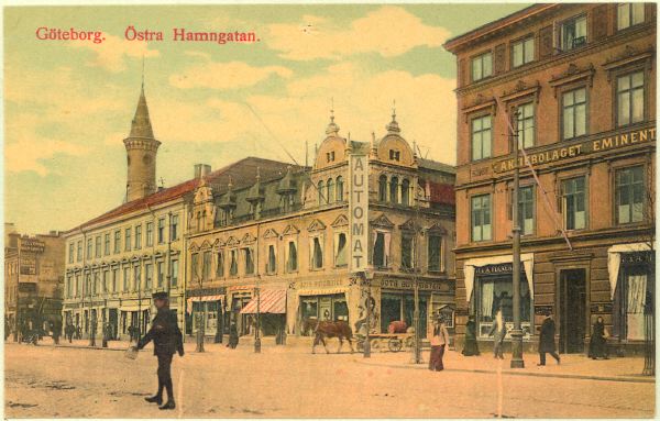 Sträckningsbild Östra Hamngatan, östra sidan mot norr, nummer 42, 44 och 46-48. På nummer 44 med skylten AUTOMAT finns caféet Göta-Automaten.