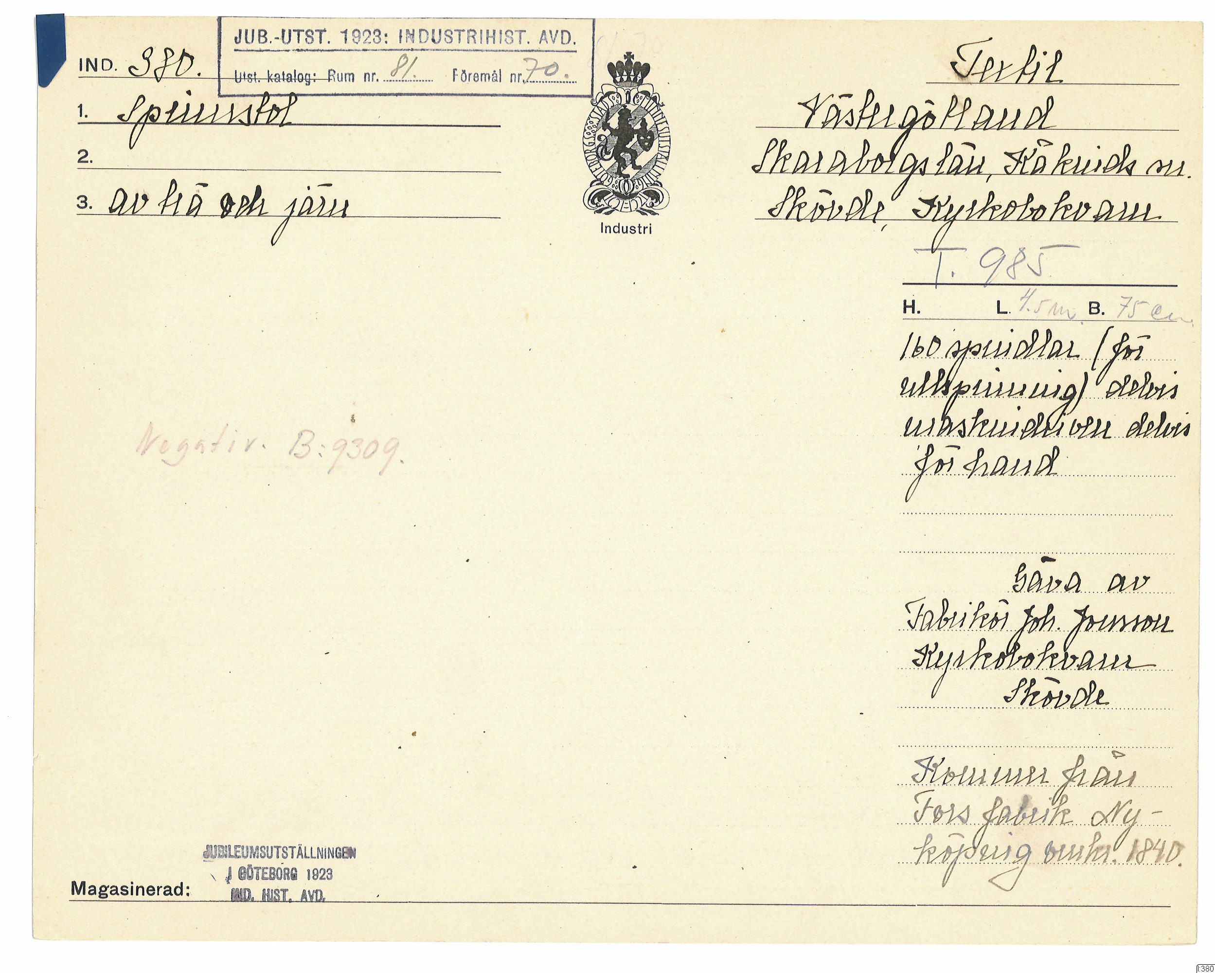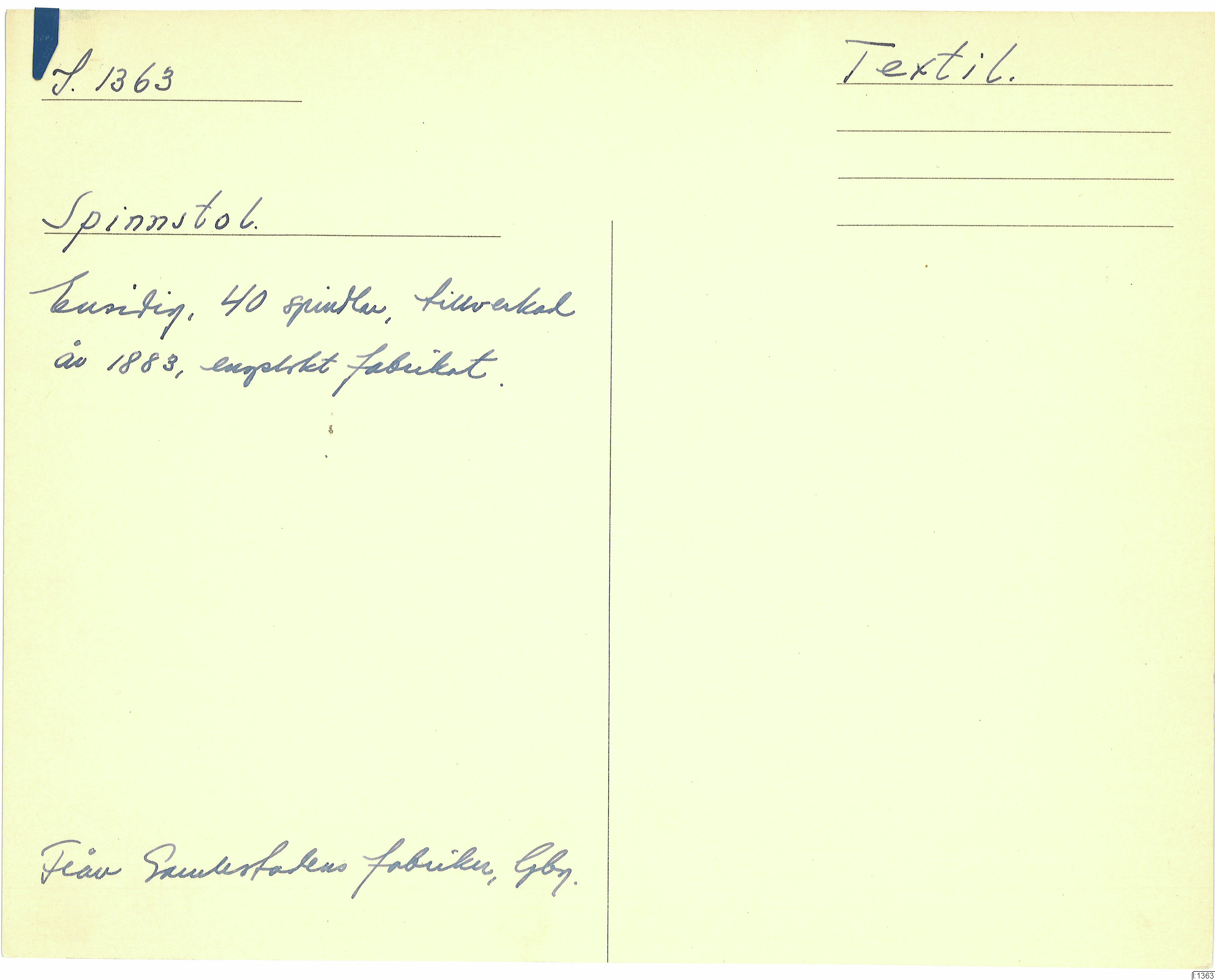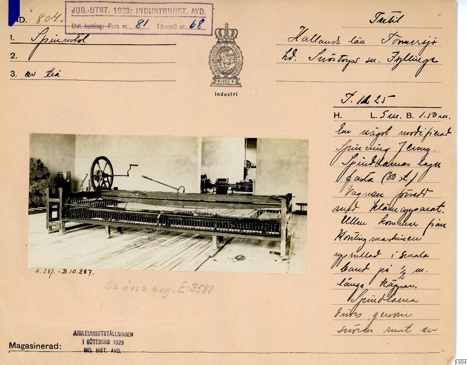 GIM katalogkort Industri 15 : Textilindustri I : Förberedande arbeten : Linberedning, bomullsberedning, ullberedning, Spinning: bomullsspinning, ullspinning