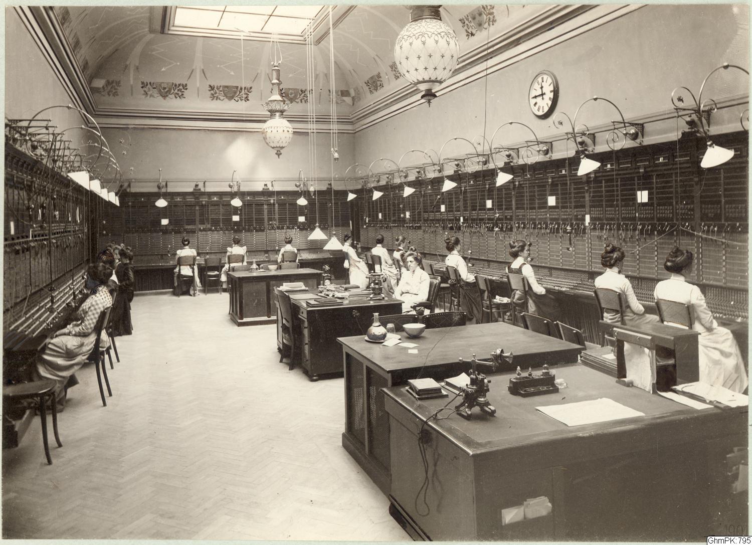 skrivbord; taklampa; lampa; interiör; kvinna; klocka; telegrafstation; telefonväxel; telefon; växeltelefonist