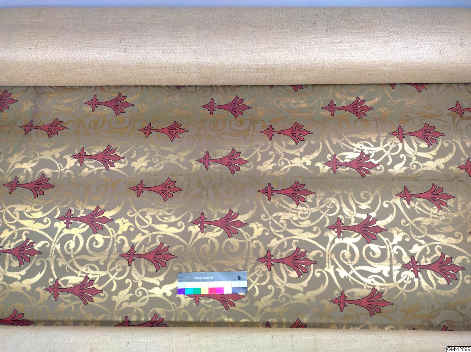 - Bemålat papper på grov väv. Motivet har matt gröngrå bakgrund med ornametik i guld och stiliserad liljeliknande röda detaljer med svart kant. Mönstret är upprepande. Fyra nubb från väggmontering hör till.