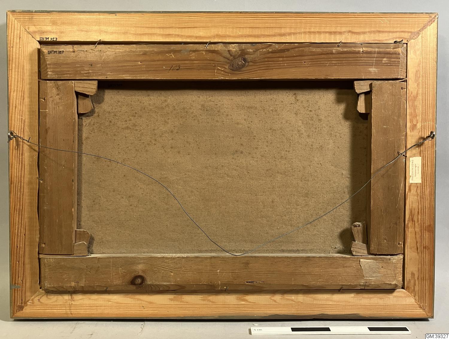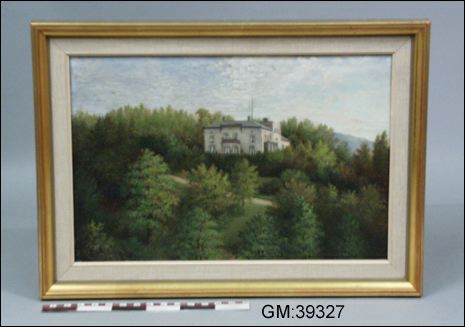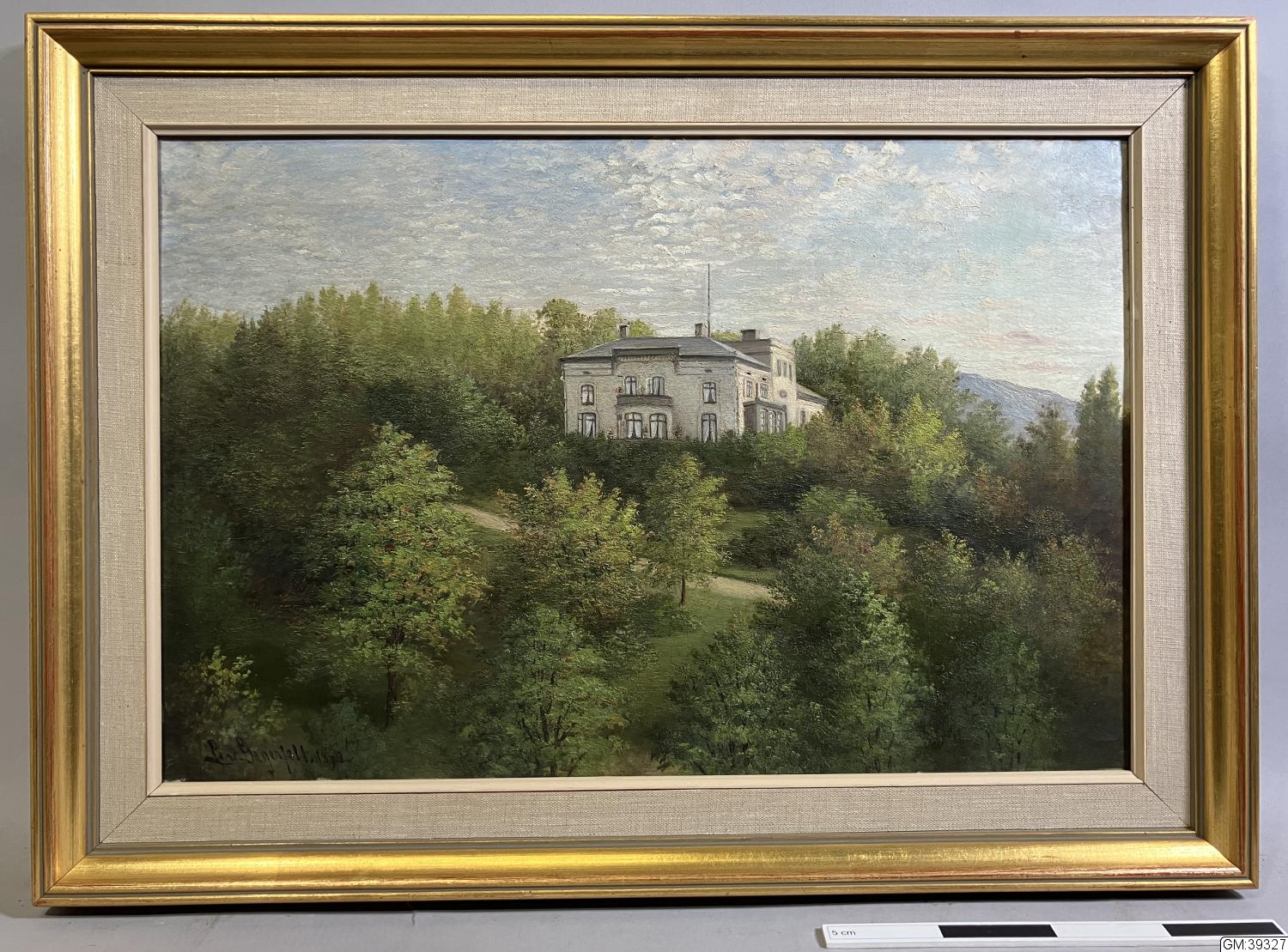 Villan "Gustafsberg" med trädgård. Signerad L.v Gegerfelt 1892. Inramad i modern ram av trä och linne i guld och grått.