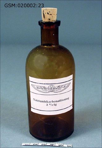 flaska som innehållit natriumbikarbonatlösning; nu tom.