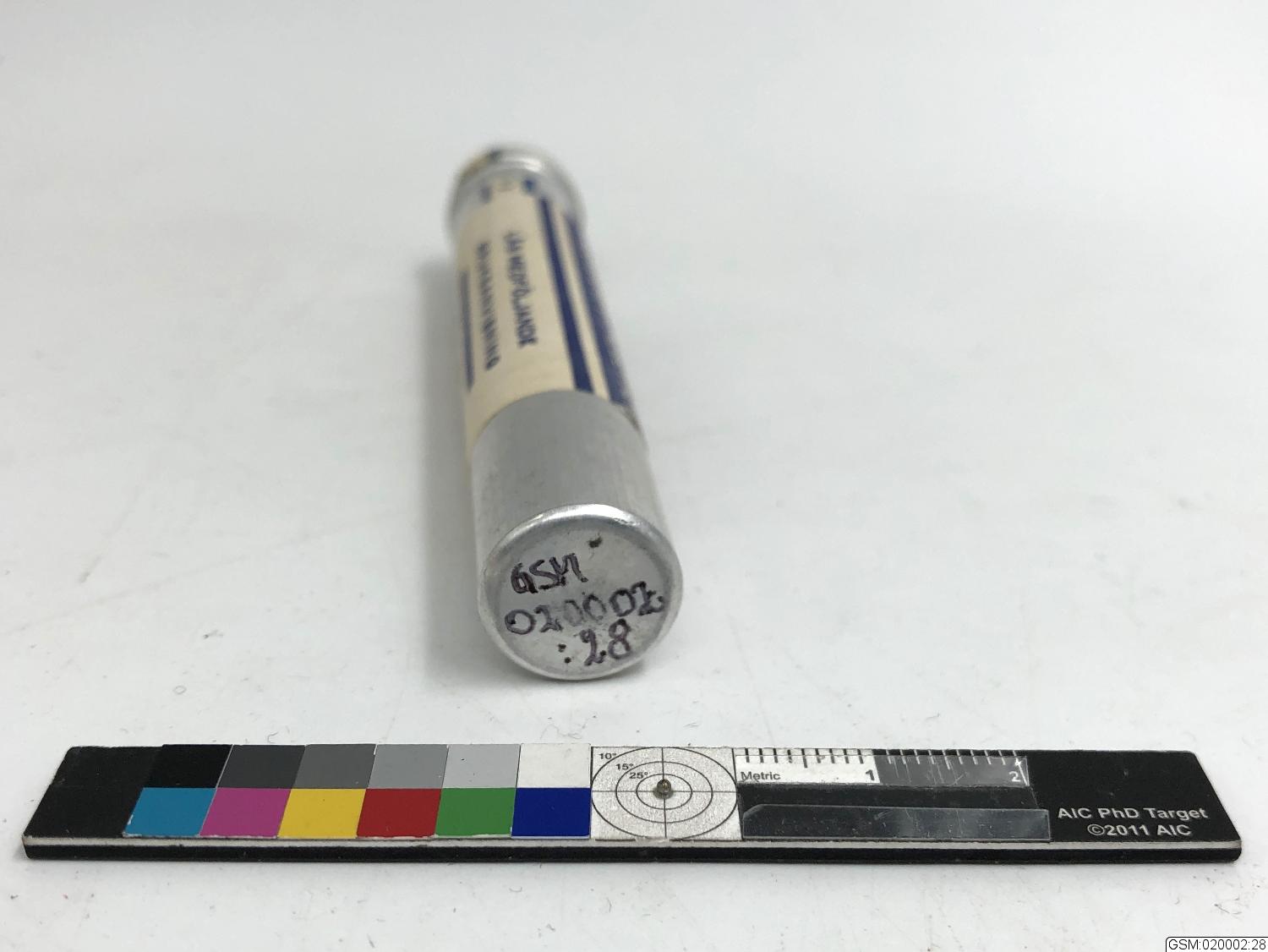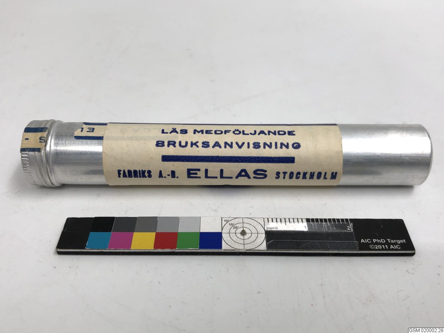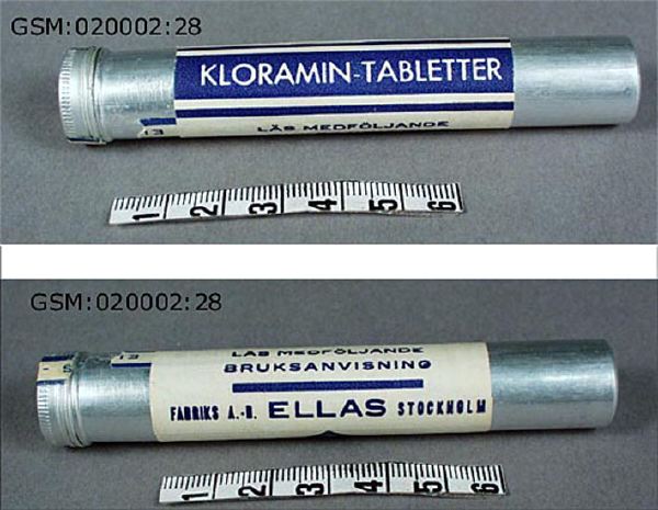 - ett metallrör med 20 tabletter om 1 gram. Till desinfektion dvs tvättning av sår och omslag användes 1%-ig lösning (2 tabletter till 200 gram vatten). Till saneringsvätska användes 5%-ig lösning (10 tabletter till 200 gram vatten)