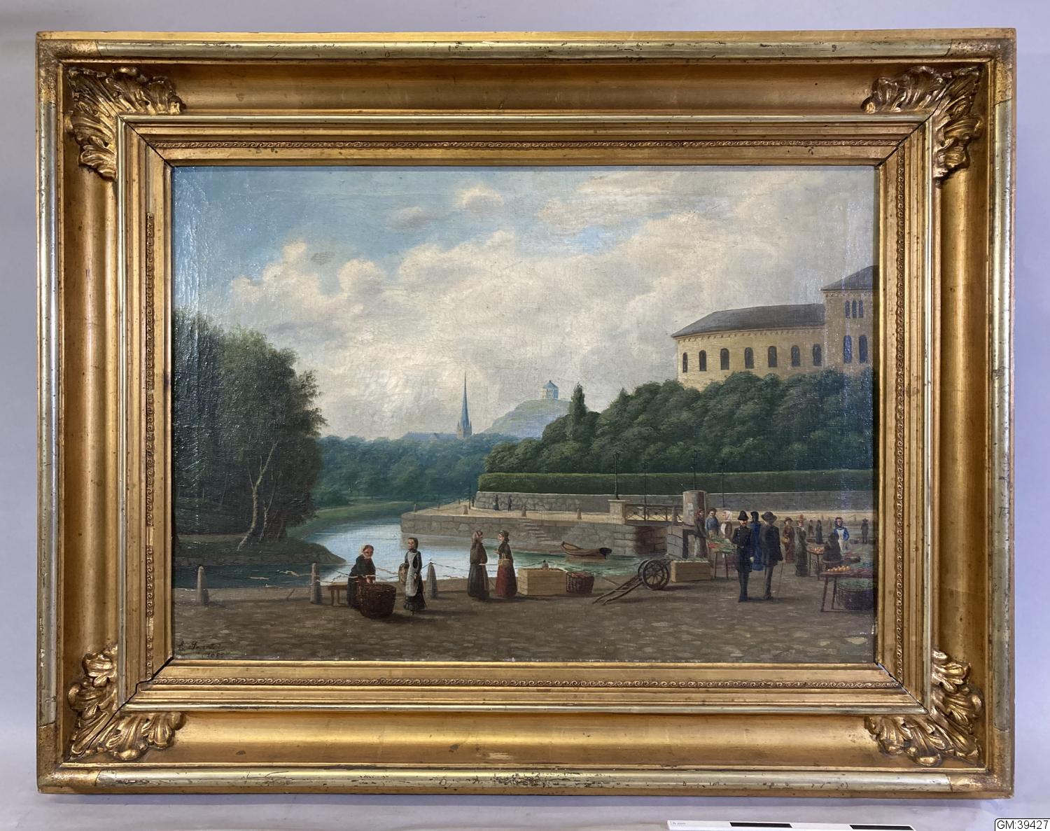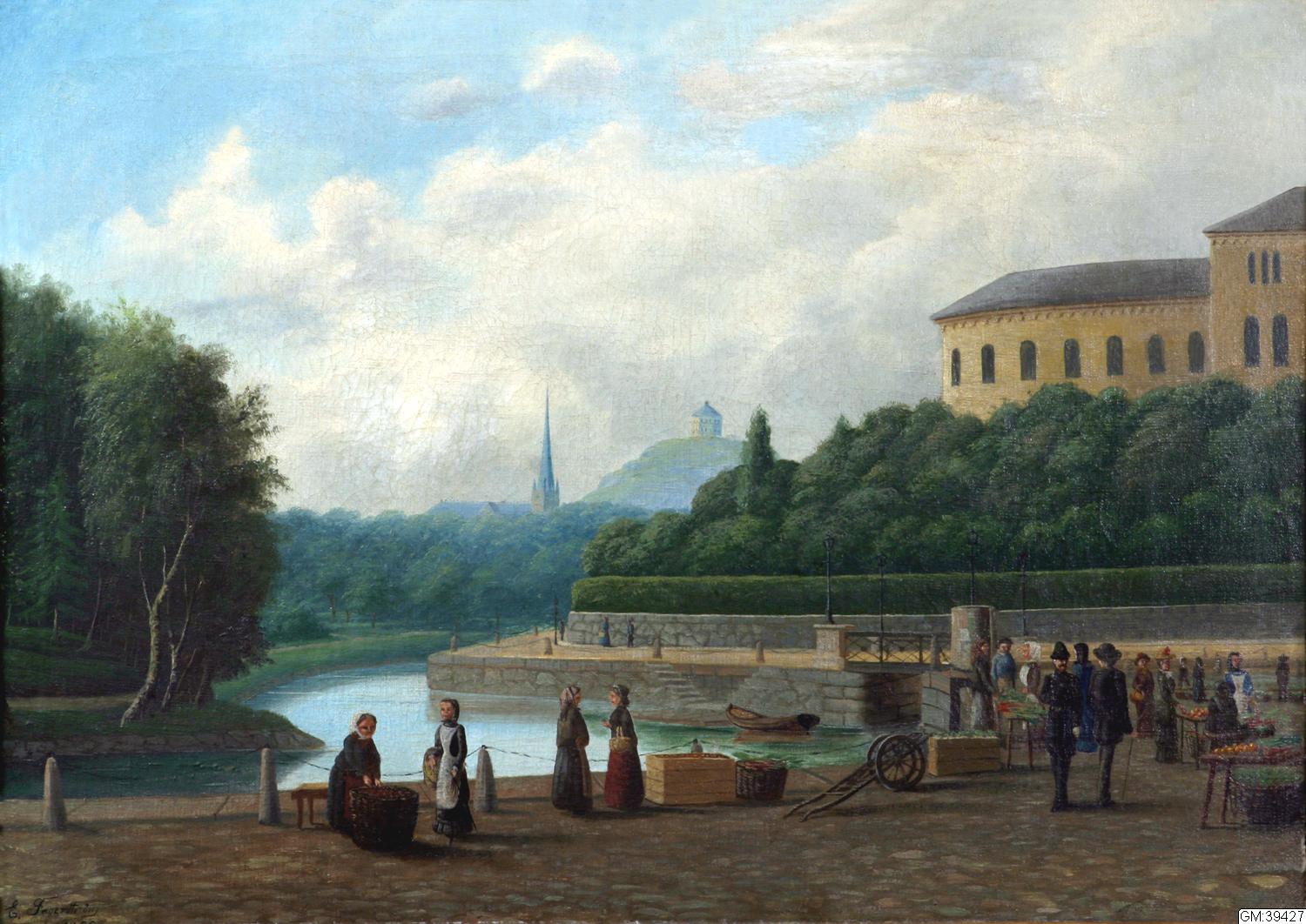 Utsikt från Grönsakstorget; Torghandel på Grönsakstorget, där bakom Vallgraven och Allmänna och Sahlgrenska sjukhuset. I fonden Hagakyrkan och Skansen Kronan.