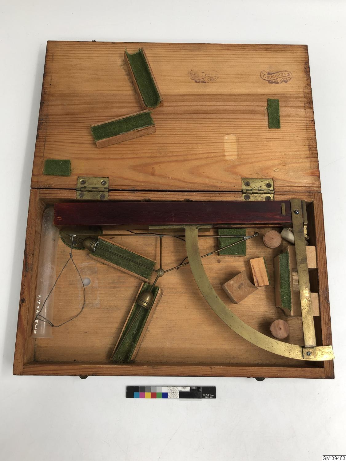 Balansvåg, bestående av 1) stativ av mahognyfärgat trä med mässingsskola; 2) triangulär vågarm med utstående ben; påskruvade tyngder; ögla för upphängning av följande: 3) vågskål - rund skiva av mässing med upphäng av tagel och liten krok; 4) provrör av glas med upphäng av ståltråd; 5) lod av mässing med svart tråd; 6) låda.
