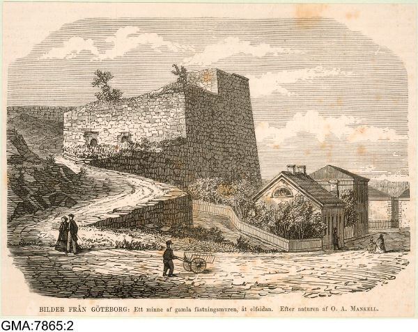 Bilder från Göteborg: Ett minne af gamla fästningsmuren, åt elfsidan. Efter naturen af O. A. Mankell.