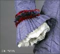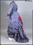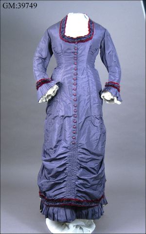 1) Överklänning av grålila sidentaft, lång prinsesskuren. Framknäppt med 20 överklädda knappar med rutmönster i vinrött. Fyrkantig halsringning, kantad med fransad veckremsa i vinrött och grålila samt vit gofferad sidenorganza. LÅng ärm med två sömmar med kantdekor plus bred plisserad remsa.