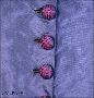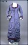 1) Överklänning av grålila sidentaft, lång prinsesskuren. Framknäppt med 20 överklädda knappar med rutmönster i vinrött. Fyrkantig halsringning, kantad med fransad veckremsa i vinrött och grålila samt vit gofferad sidenorganza. LÅng ärm med två sömmar med kantdekor plus bred plisserad remsa.