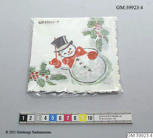 :4 Ett mindre antal julservetter dekorerade med snögubbe i hörnen och bladverk i grönt, rött och guld längs kanterna. Mått:13 cm