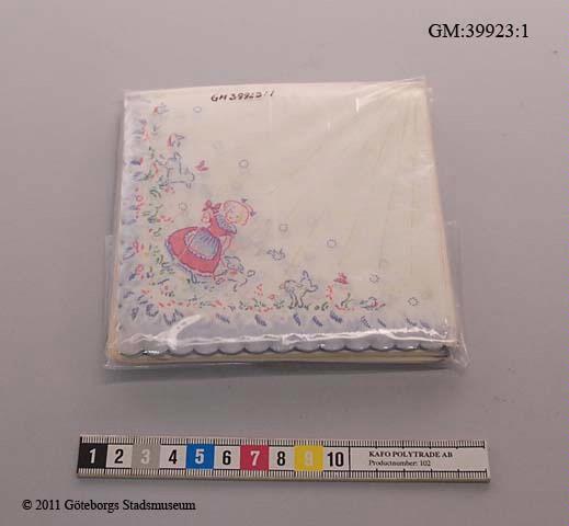 :1 Ett antal servetter, flerfärgat dekorerade med flicka och lamm i hörnen. Kanterna är ljust blålila. Mått 13cm
