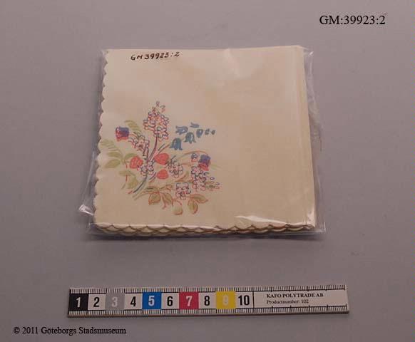 :2 Ett antal servetter dekorerade i hörnen med en flerfärgad blombukett med smultron. Mått:12,5 cm