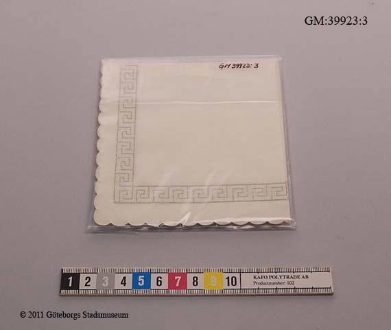:3 Ett mindre antal servetter dekorerade med meanderbård i guld längs kanterna. Mått 11,5 cm.