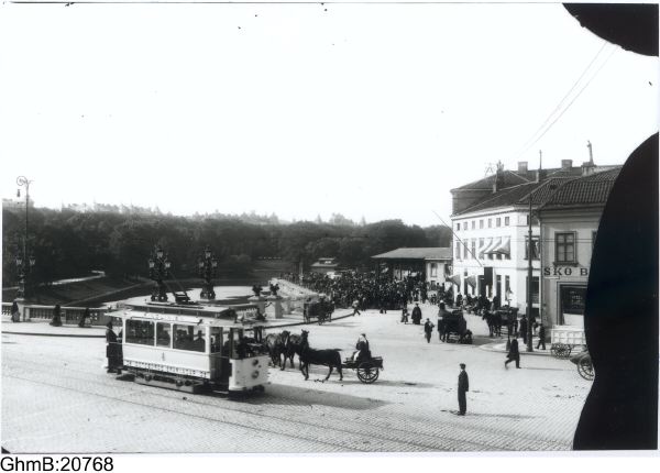 skyltfönster; häst; vagn; dag; exteriör; vallgrav; spårväg; gatubelysning; spårvagn; folksamling