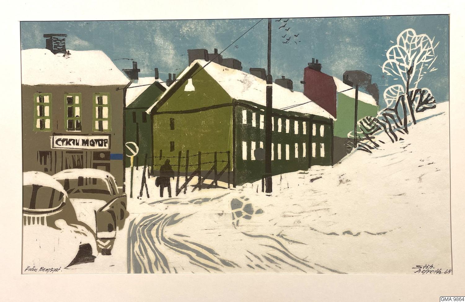 "Från Bergsgatan", kolorerat linoleumsnitt av Stig-Allan Agroth, 1968.; Bilden visas ej av upphovsrättsliga skäl.
