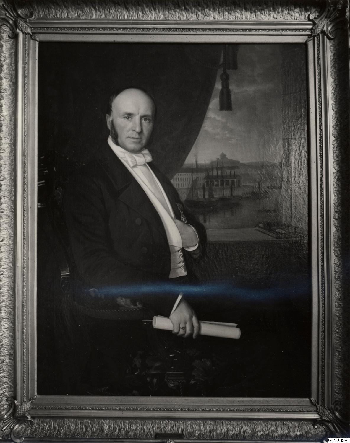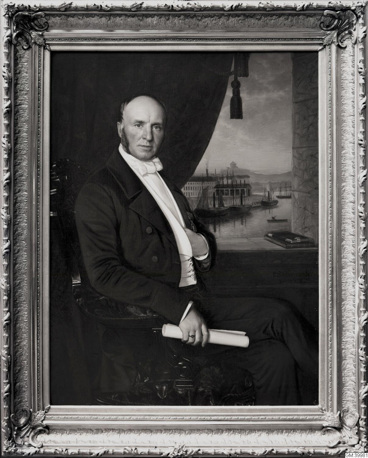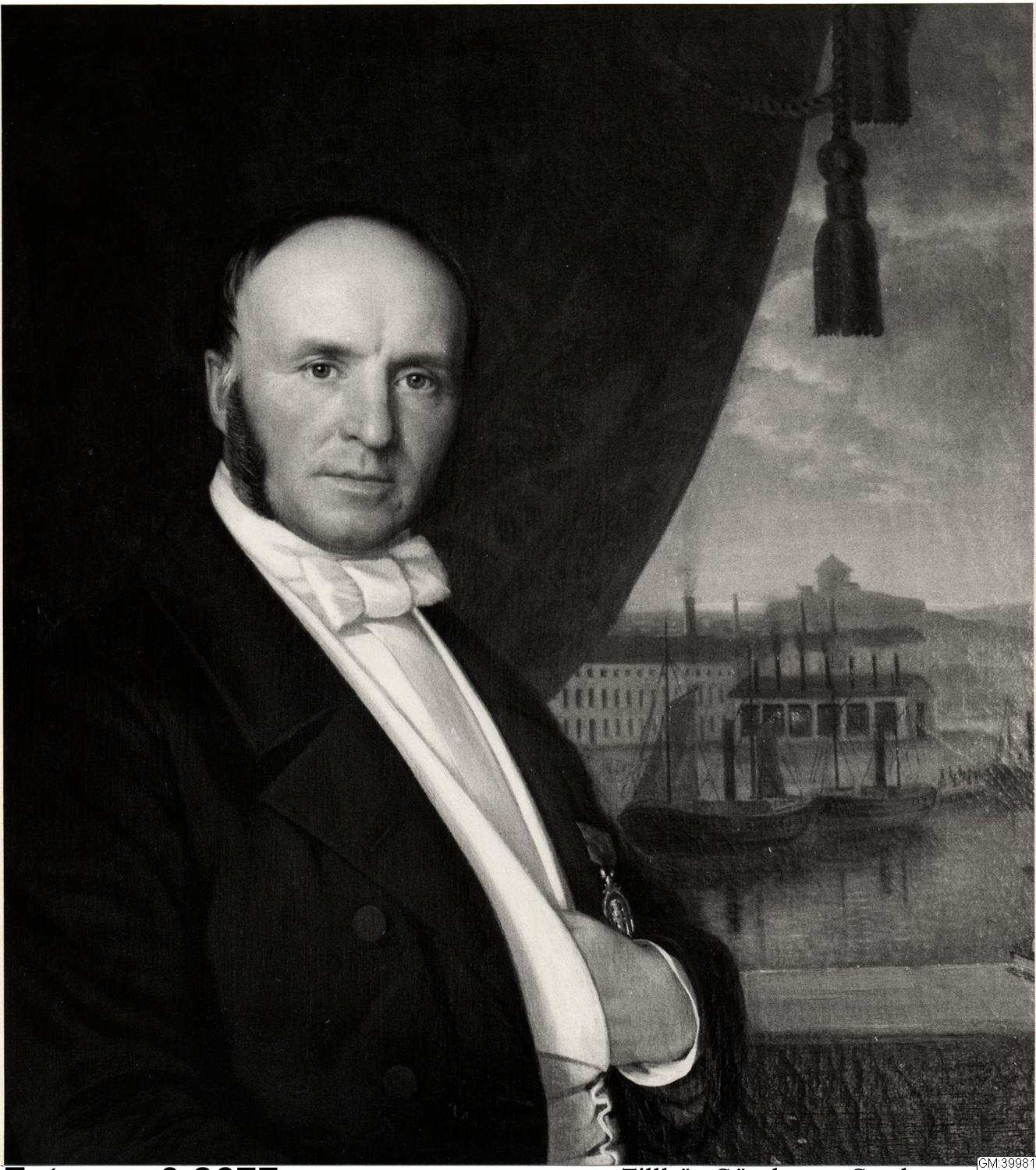 Porträtt av Alexander Keiller, siitande i halvfugur. I bakgrunden, utsikt från Keillers våning vid Norra Hamngatan 4, Göteborgs Mekaniska verkstad vid Skeppsbron. I fonden Skansen Kronan.
