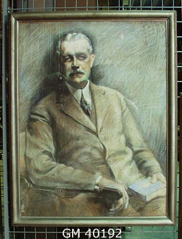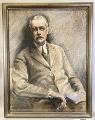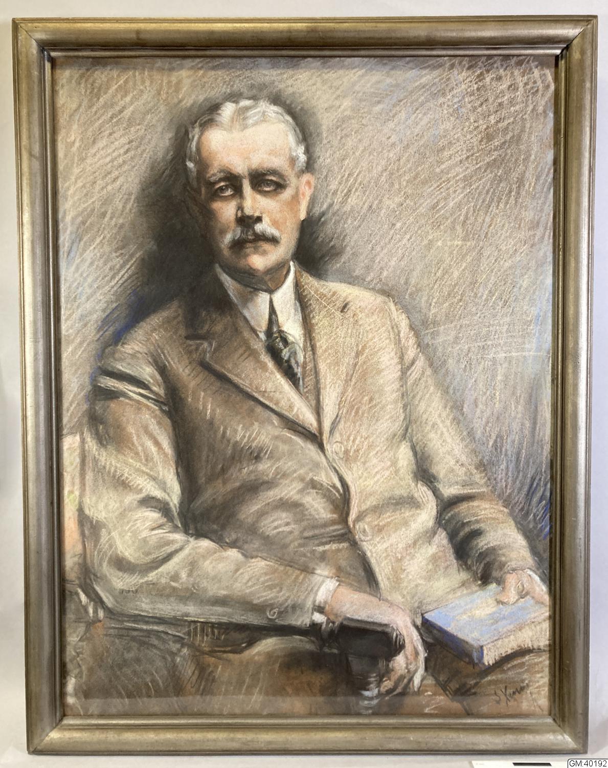 Tavla - mansporträtt. Pastell inom glas och ram: porträtt av man i halvfigur i övre medelåldern, sittande i länsstol, med bok i ena handen. Målat efter fotografi (Jfr GMA 4972:10)