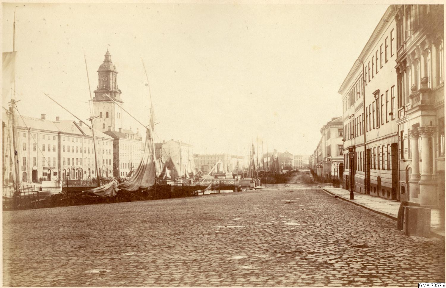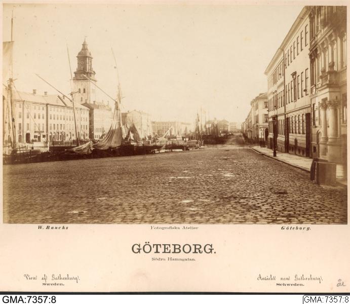 - Sträckningsbild, tagen vid Lilla Torget österut med Södra Hamngatan, Stora Hamnkanalen och Norra Hamngatan. Till vänster i bild Norra Hamngatan 12, Göteborgs Museum. I fonden Göta Källare.