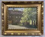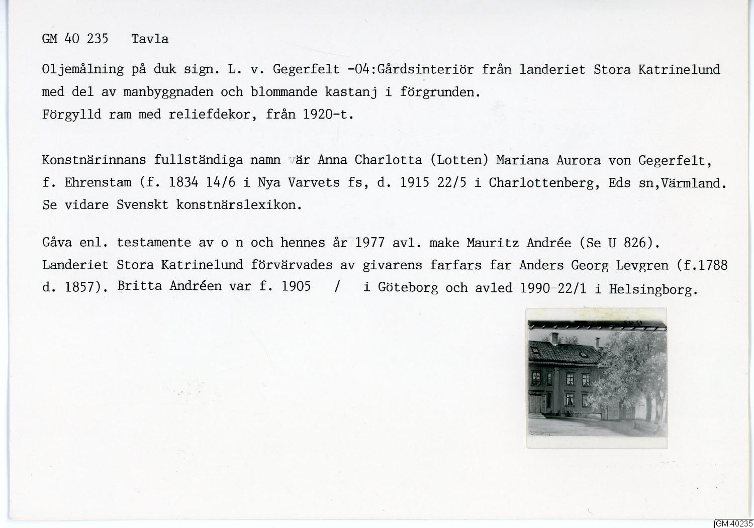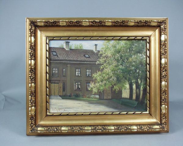 - på tavlan ser man en del av manbyggnaden och blommande kastanj i förgrunden