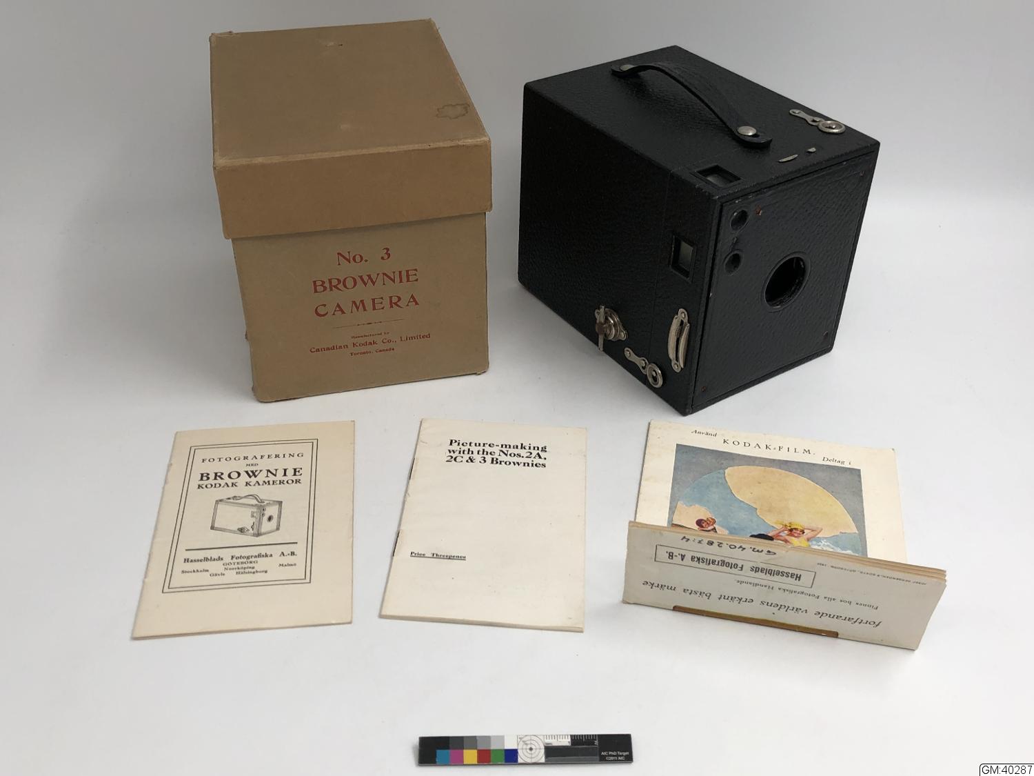 - LÅDKAMERA#1/ Kamera. Lådformigt kamerahus av trä klätt med svart saffian, förnicklade beslag, läderhandtag; framdelen med slutare och filmhållare av svarteloxerad plåt utdragbar: linser placerad innanför slutaren; sökare dels för vertikala, dels för horisontella bilder; tre bländarval. Avsedd att laddas med Kodak rullfilm nr 124, såsom anges vid typmärket baktill.#2-3/ Varukartong med lock av ljusbrun papp, på kortändan med följ. text: "No 3 / Brownie / Manufactured bt / Canadian Kodac Co., Limited / Toronto, Canada."#4/ Reklambroschyr från Hasselblads Fotografiska AB för Kodaks film och kameror, tryckt 1925 i Gbg.#5/ Bruksanvisning för Brownie.kameror på engelska.#6/ Dito på svenska, utg. av Hasselblads Fotografiska AB och tryckt på Josef Bergendahls Boktryckeri i Gbg 1924.