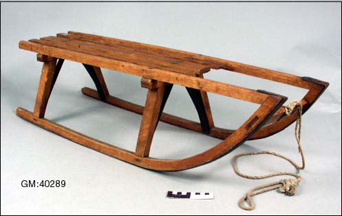- Kälke för barn. Underrede av stålskodda medar och två järnförstärkta bockar; sits: två sidolister som framtill förenar sig med de uppböjda medarna och däremellan tre glest placerade bräder fastskruvade vid bockarna. Framslå mellan medarna varvid styrlina av bomullsrep är fäst.