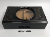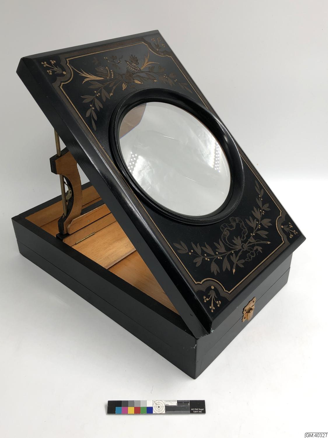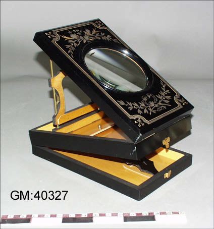 Betraktningsapparat för fotografier. Svart lackskrin med i locket infälld förstoringslins.