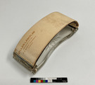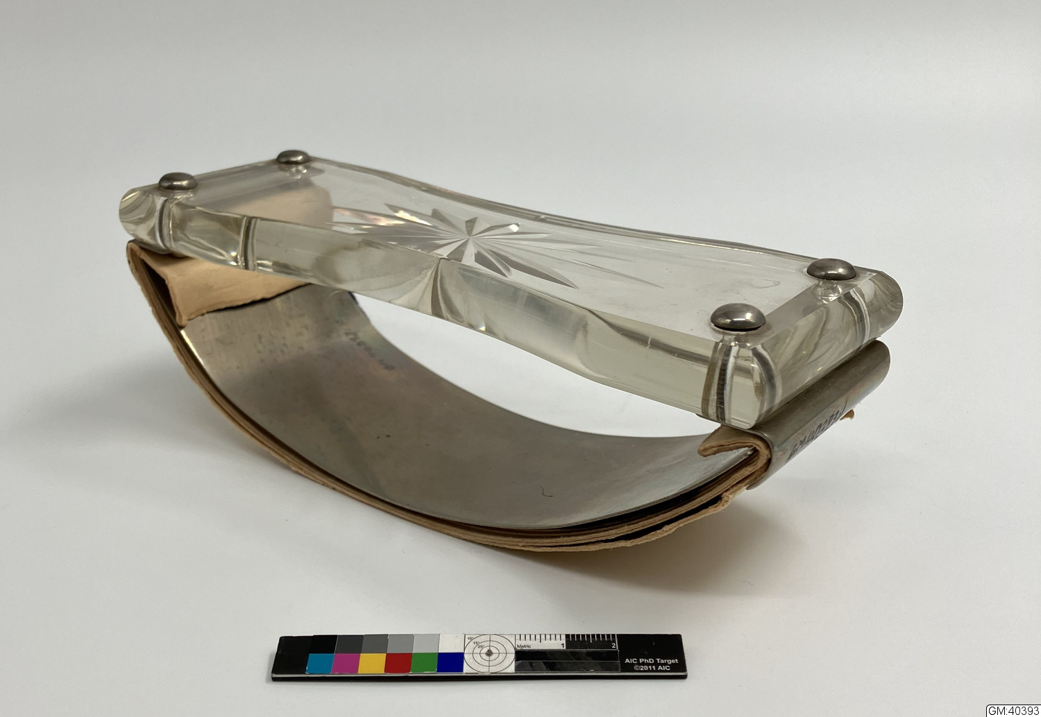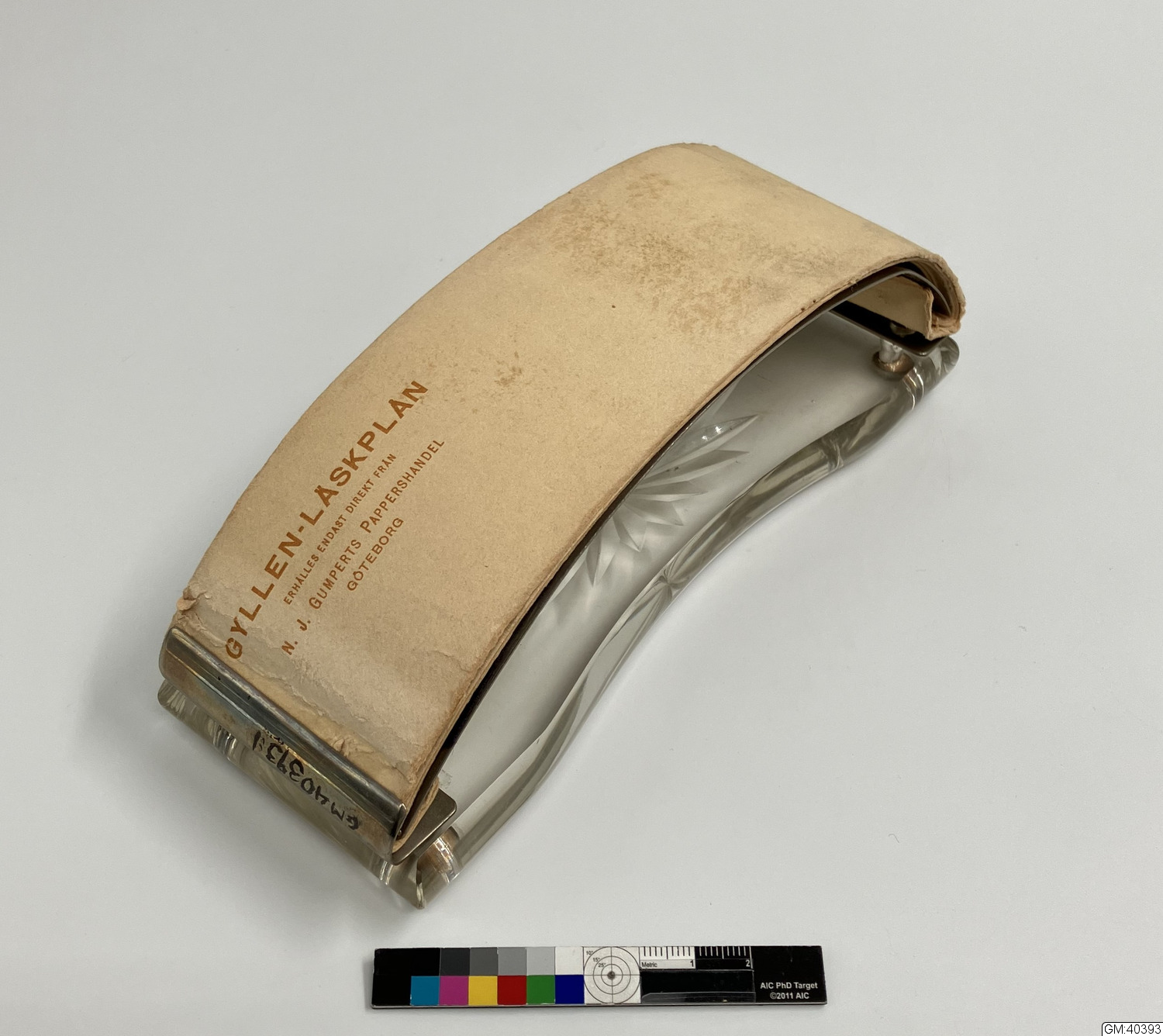 - Läskpress . Handtag-ovansida av glas med konkava sidor och slipad stjärna som dekor. Beslag av stål i kortändarna, fastsatta med fyra dekorativa stålnitar, i vilka är inträtt ett välvt plån av stål som underlag för läskpappren. Dessa har påttrycket "GYLLEN-LÄSKPLÅN Erhålles endast direkt från N.J Gumperts Pappershandel i Göteborg". Mellan pappren och stålplånet en bot filt.