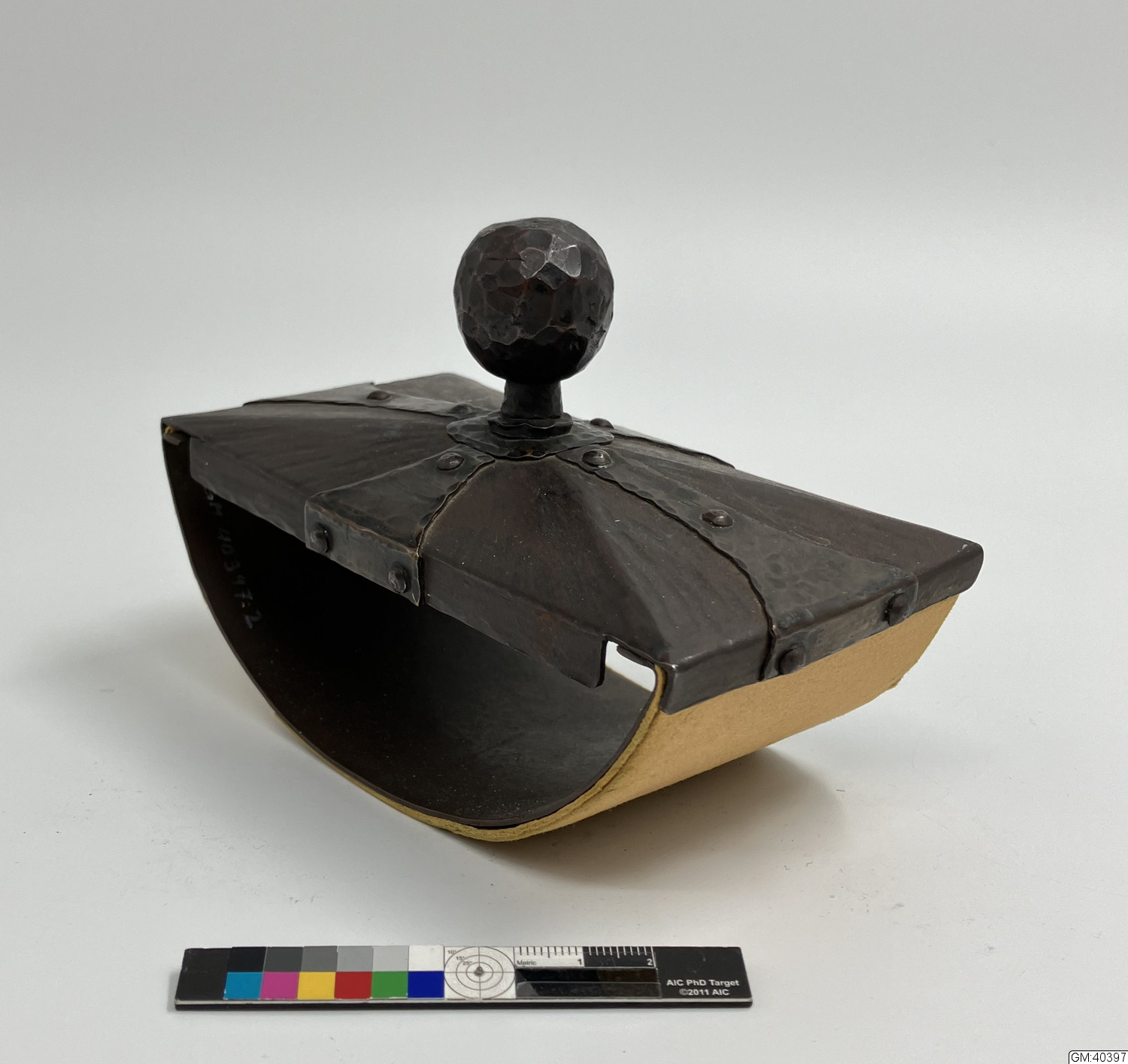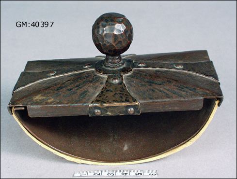 - ovansida med handtagsknopp av hamrad, kopparfärgad mässingsplåt med beslagsdekor; på en stomme av järnplåt. Löstagbar välvd mässingsplåt, på ovansidan kopparfärgad, som underlag för grönt läskpapper.