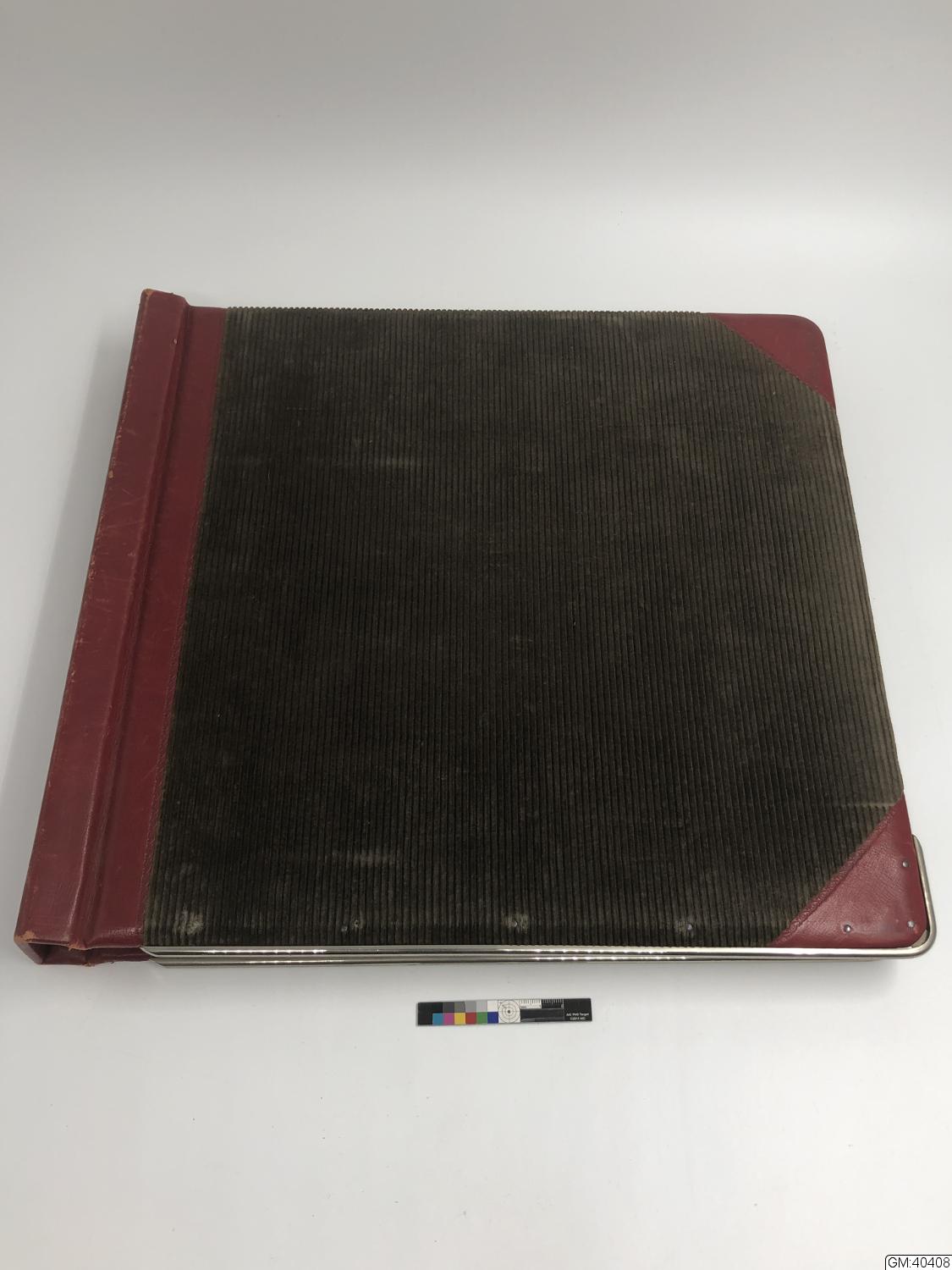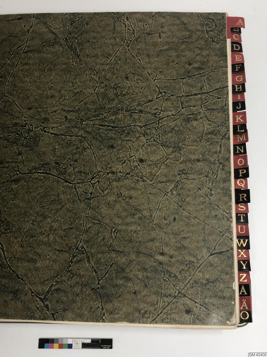 Räkenskapsbok i form av ringpärm med lösa blad och alfabetiskt register. Pärm av trä klädd med grågrön manchester; rygg och hörn av röd saffian; nedtill stålkantad; invändigt klädd med papper, marmorerat i grönt; registerflikar i omväxlande svar och röd saffian med bokstäver i guldtryck.