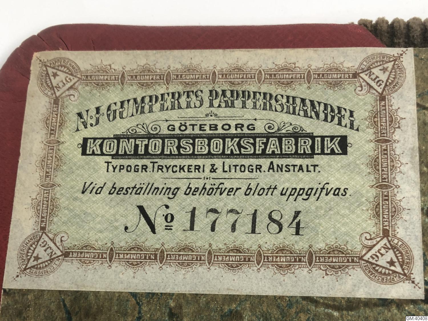 På pärmens insida en pappersetikett med texten: "N .J Gumperts pappershandel. Göteborg. KOntorsfabrik. Typogr. tryckeri & Litogr. anstalt. Vid beställning behöfver blott uppgifvas N:o 177184"