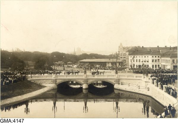 - Konung Oscar II beser den nyligen öppnade Kungsportsbron (konungen och troligen byggnadschefen major Philip Åqvist stå vid broräcket midt öfver norra brohvalfvet). Tidigare har det framgått att det är herr P. Fürstenberg som står med kungen, men enligt den samtida pressen var han inte närvarande.