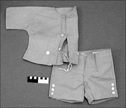 - GM 40 471:1-:2 turkos gosskostym, byxor ska knäppas med överdel.#:1 Jacka, bomullstyg/rips, kimonostjärning. Dold knäppning, översta knappen saknas. Benknappar, dragsko i midja. 4 pärlemoknappar att knäppa i byxor (i midja).#:2 Kortbyxor med lucka, i material som ovan. Välsydda sömmar. På benens utsida 3 st dekorativa knappar i pärlemo.