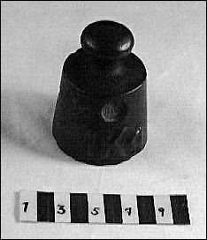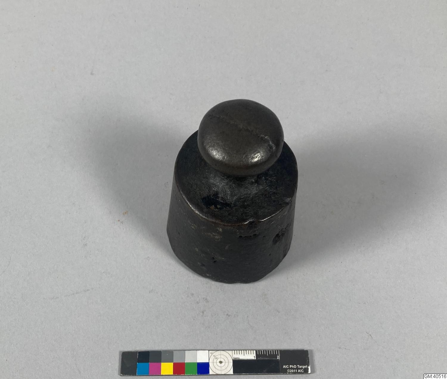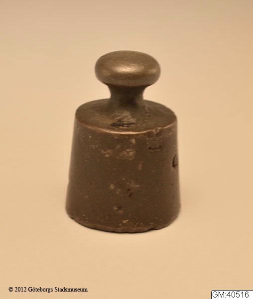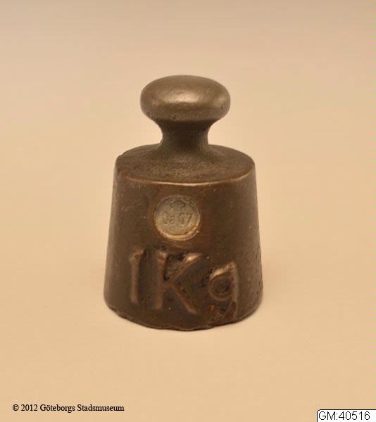 Kilovikt i gjutjärn med texten "1 Kg" i relief: nedsänkt justeringsplomb med texten "Oa67" under krona, av bly.