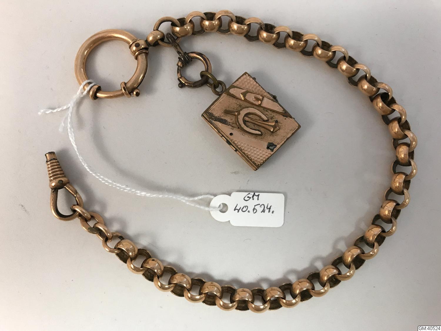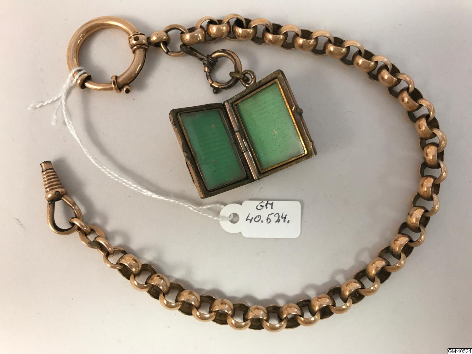- Klockkedja med berlock länk av drygt 3 mm breda ringar i förgyllt material - gulddoublé e d; ring för fastsättning i väst; berlock i samma material i form av ett litet album med dekor av hästsko mm, öppningsbart - inuti plats för ett litet foto.