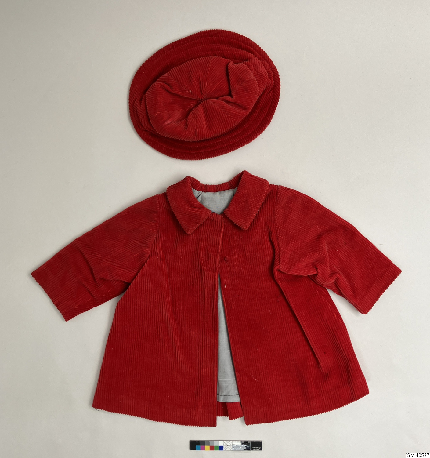 - Kappa och hatt av röd bomullsmanchester. 1/Kappan har insydd ärm, knäpps med 2 hakor och hyska. Liten liggande krage, motveck bak. Helfodrad med grått tyg. 2/ Hatt. Kulle av 6 kilar, brätte i dubbelt tyg svagt utsvängd med 5 rader stickningar. Kullen fodrad med vitt tyg. Omkrets inuti kullen 33,5 cm.#Christina Norén hade själv kappa och hatt i samma modeller men i annan färg.