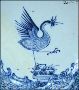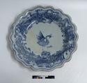 - Smalt brätte med vågig kontur som upprepas i två relieflinjer. Tjockt ljusblått porslin med blå underglasyrmålning: bred rokokobård på brätte och kep med blommor och blad samt olika turmönster. På bården står en trana, hämtad från familjen Grills vapen, vilken bildar mittornament. Brun kant på brättet.