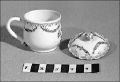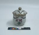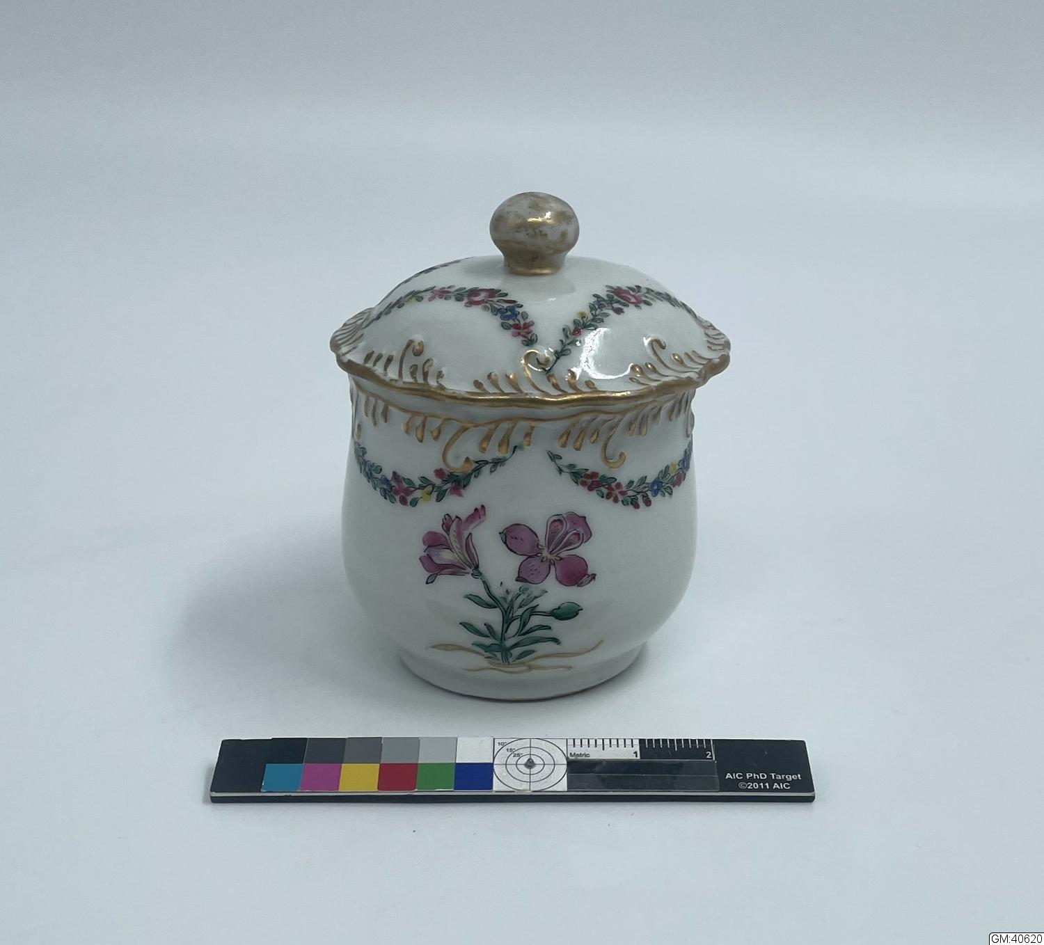 krämkopp med lock, bukig, uppåt avsmalnande med lodgrepe och välvt något utskjutande lock med rund knopp. Lockets kant vågig, förgylld rokokoranka i relief på lockets kant och vid koppens mynning. Från denna kantbård utgår på både lock och kopp en blomgirland i grönt, rött, blått, guld och violett. På koppen, mittemot grepen, dessutom en inkalilja - av Linné benämnd Alstromenia efter lärjungen Klas Alströmer - i violett, grönt och gult. Lockknopp och grepe förgyllda.