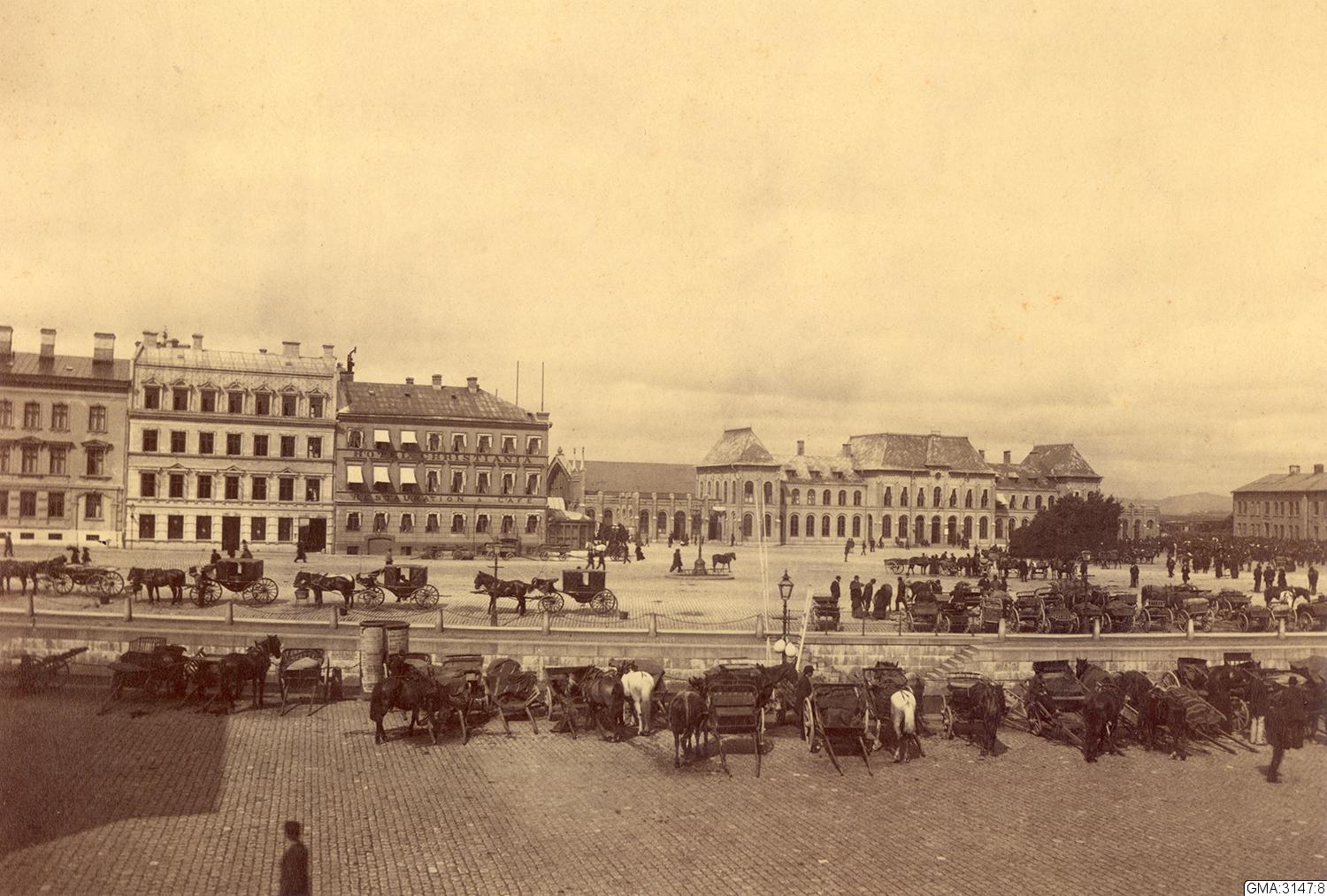 - Drottningtorget med Hotel Eggers och Statens Järnvägsstation, sett från Södra Hamngatan.