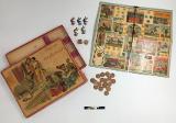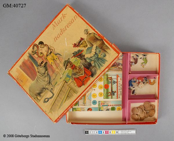 - Sällskapsspel "Marknadsresan" Röd pappask med poykromt lock, tryckt bild.#1) Spelplan, 29,5 x 31,5 cm ihopvikbar till 1/4, av grön papp med påklistrat polykromt tryck med 50 stationer därav 18 med illustrationer: olika markandsnöjen - positivhalare, prickskytte, lyckohjul, roulette, biljard, karusell mm. #2) Tärning av trä med röda prickar, 1,4 cm/sida. 3-7) Markörer i form av pajasfigurer gjutna i tenn och målade i olika färger, 3,7 cm höga; en färg för varje spelare. En figur skadad - bruten i två delar (nr 6). #8-25) Spelmarker - runda "mynt" i mönsterpräglad brun papp: olika valörer på åtsidan, olika djur på framsidan; 1,9 cm i diameter. #26) Kartong med lock vari spelet förvaras. På locket cirkusartist med orm och flodhäst inför publik; inredd med fyra fack. #På undersidan skrivet med blyerts: "Greta Karlsson julafton 1911". Spelregler på lockets insida. #Kartongen något skadad och nött.
