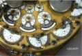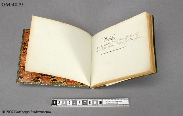 räknemaskin (Sauteriska räknemaskinen), mässing med handtag i annan metall, blå bård, lövmönster utmed sidorna. Ingraverad text "Maschine ohne nachzudenken geschwind und sicher damit rechnen zu können von Sauter in Esslingen".