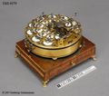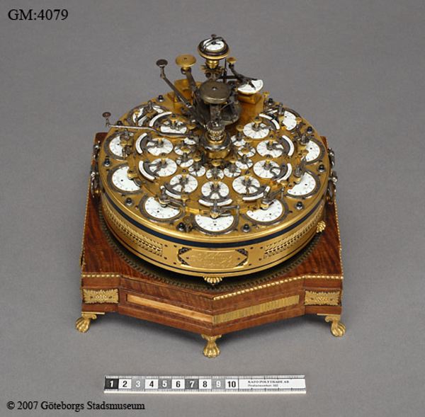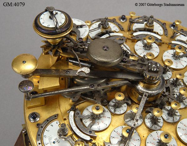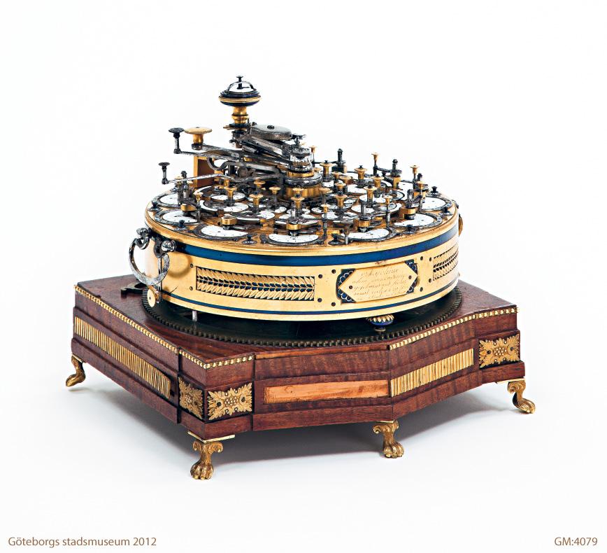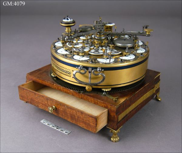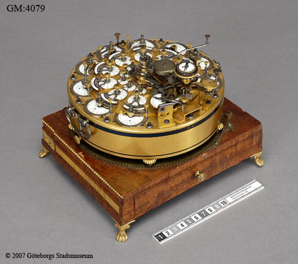 De yttre delarnas utseende och rörelse. Det sirliga av i eld starkt färgylld mässing och engelskt stål arbetade 7½ tum breda 2 tum höga, runda, på en nätt fot stående fodralet innesluter detta verks huvudinrättning. På den högra horizontala plattan befinna sig 3 rader emaljerade nummerskivor, 9 i varje rad. De innersta små skivorna äro betecknade med de 10 siffrorna från 0 till 9, de mellersta skivorna visa dessa siffror 2 gånger, svart i större och rött i mindre omfång. De förra tjäna till addering och multiplicering, och senare subtrahering och dividering varje skiva vänder sig omkring sin medelpunkt.