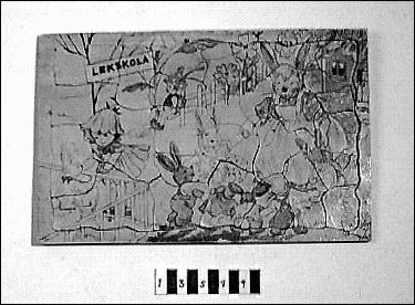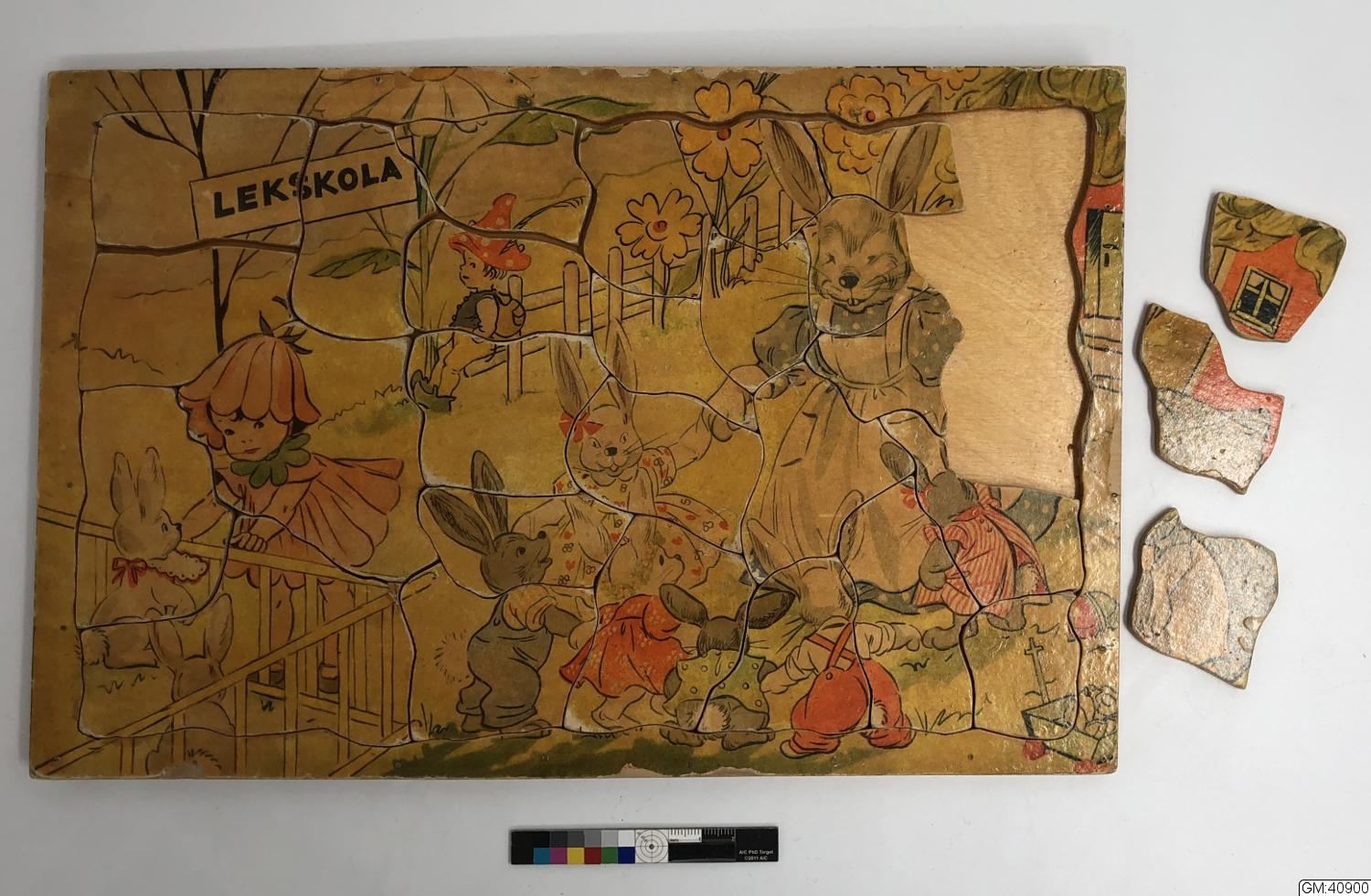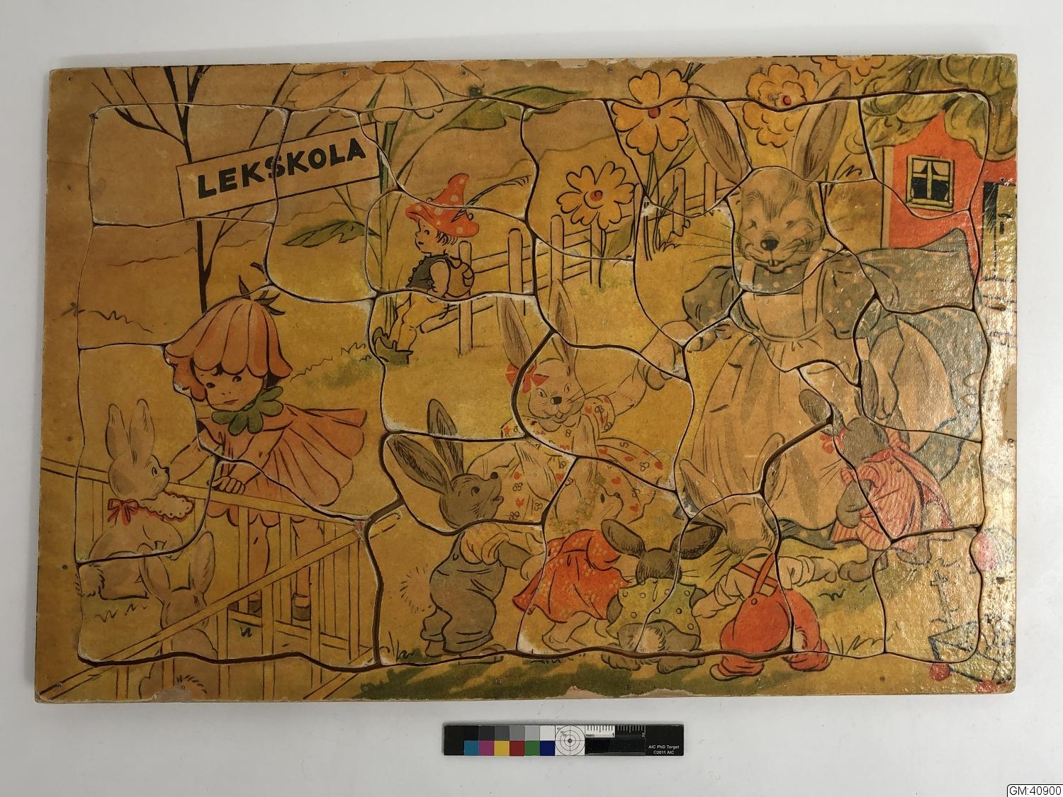 - Barnpussel i trä föreställande "LEKSKOLA", kaninmamman som dansar ringdans med småkaninerna, en liten flicka hälsar på kaninerna som sitter i lekhagen, en pojke lutar sig mot staketet. Pusslet är buckligt.