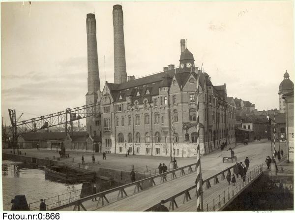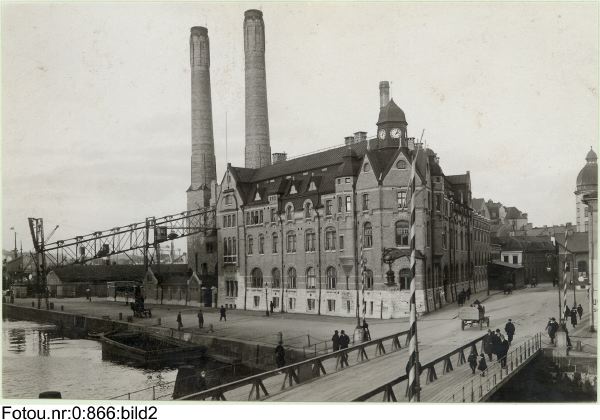 industribyggnad; elindustri; elverk; arkitektur; dag; exteriör; fasadutformning; skorsten; bro; kanal; pråm; gångtrafikant; bil; hästtransport; häst; vagn; vår; höst