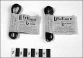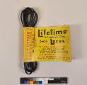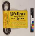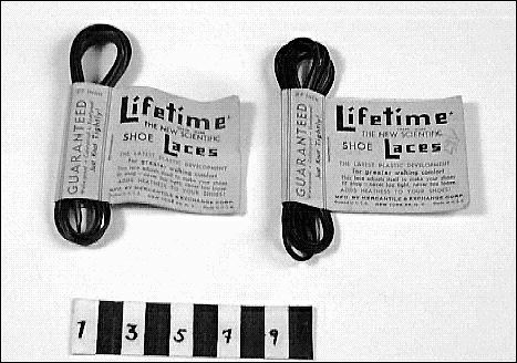 - :1 svarta plastskosnören, ihopsatta med gul lapp i papp med svart och röd text " Guaranteed Waterproof. Colorproof. Knotproof. Just Knot Tightly !" samt "Lifetime Trade mark, The New Scientific Shoe Lacec. The Latest Plastic Development. For greater walking comfort. This lace adjusts itself to make your shoes fit snug - never too tight, never to loose. Adds Neatness To Your Shoes !. MFD. By Mercantile & Exchange Corp. Printed in U.S.A New York 24 N.Y Made in U.S.A" denna text står på båda sidor om pappret men på ena sidan står det också "U.S.A Patents & Foreign Patents Pending * Reg. U.S.A Pat.Off."#:2 bruna plastskosnören med samma text som ovan. "MFD.By Mercantile & Exchange Corp, New York 24 N.Y USA"