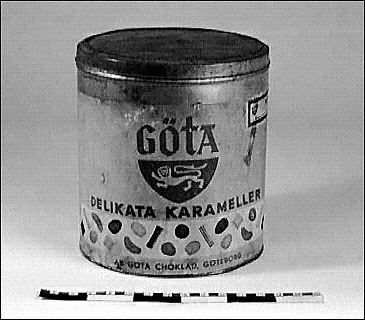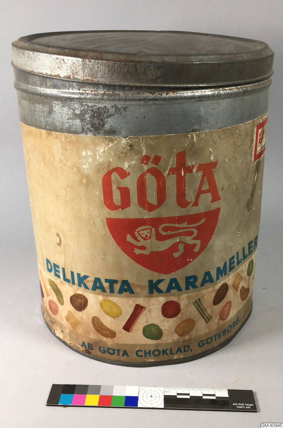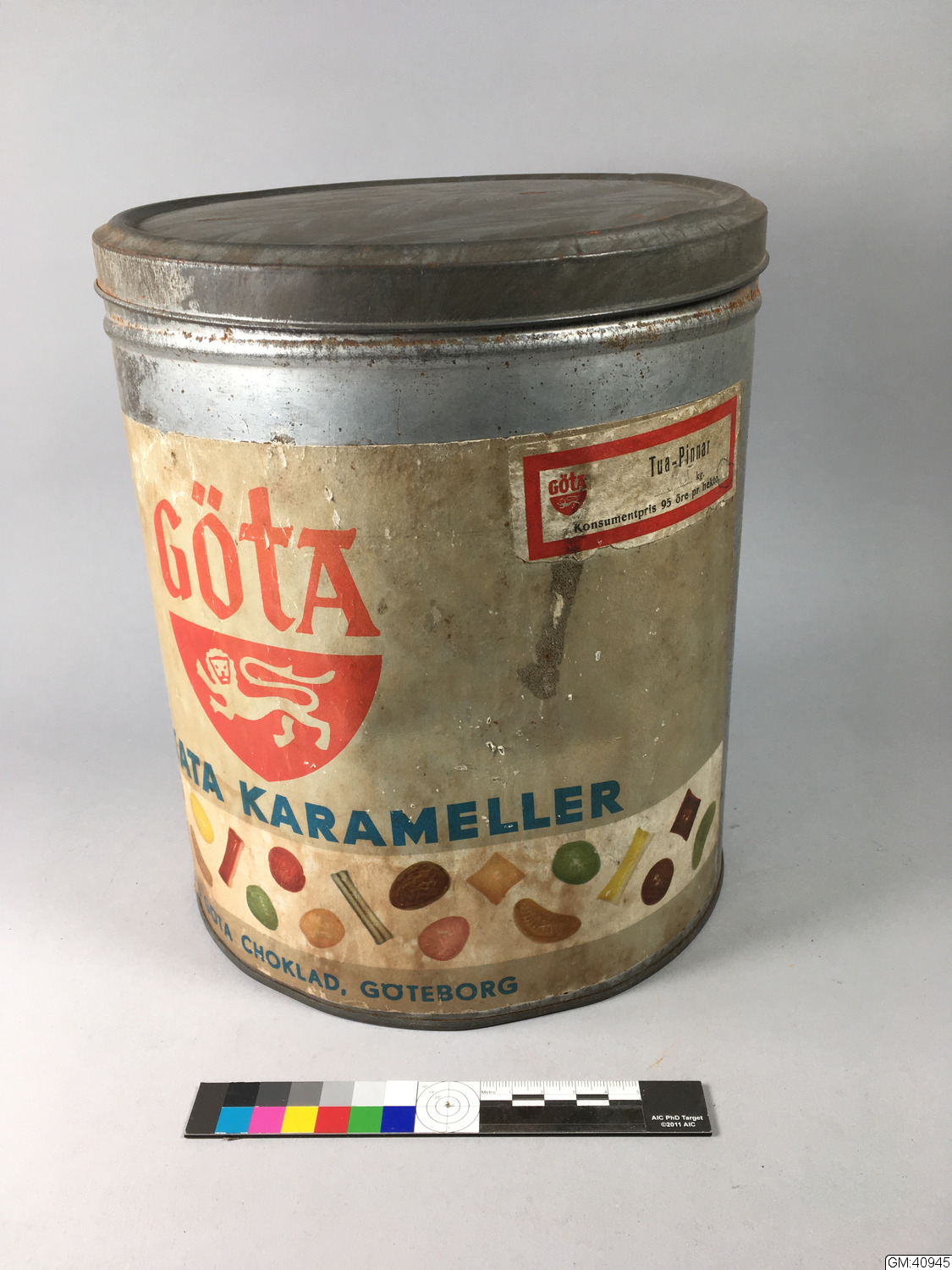 - Karamellburk i plåt med texten "Göta Delikata Karameller, AB Göta Choklad Göteborg", med lejon och en lång rad av olika karameller. På klisterlapp "Göta Tua-Pinnar.......kg. Konsumentpris 95 öre pr hekto"