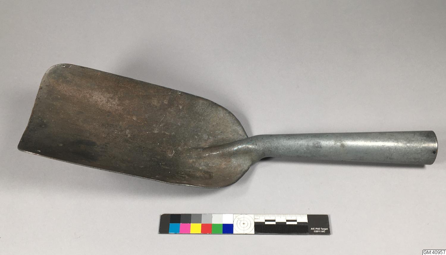 Har antagligen använts i matvaruaffär, där man hällt upp karameller, kaffe, te eller annat torrt med den.