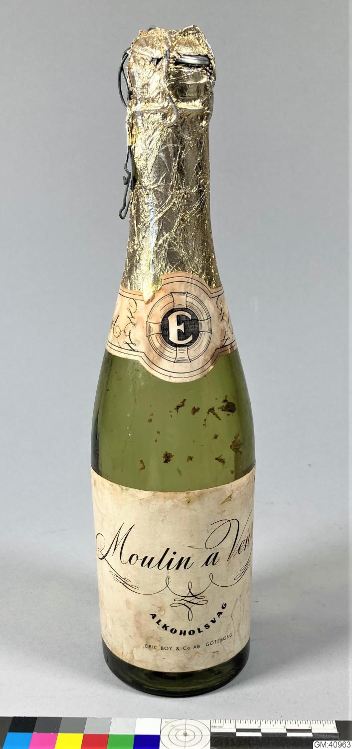 - Brun glasflaska med guldfärgad folie runt korken. Vit etikett med svart text mitt på flaskan "Moulin a Vent Alkoholsvag Eric Boy & Co AB Göteborg". Längst det guldfärgade foliet längst upp sitter ett emblem "E" samt "Moulin a Vent" på två ställen.#Vinet är urtappat.