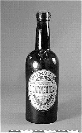 - Stor porterflaska för skyltning. Brunt glas med varumärket fastklistat på framsidan med text " D.CARNEGIE & CO, PORTER GÖTEBORG, PORTER BRYGGERIAKTIEBOLAGET" samt korkstämpel. Ipluggad kork, låst med järntråd (tvinnad).