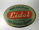 Karamellburk av plåt. Burken är guldfärgad med har fält av vit bakgrund (på sidorna) med röda långa streck som dras till mitten där det finns varumärke, ljusblå bottenfärg med mörkare blå text (Lidol i vitt med röd bakgrund :#"BRÖST-KARAMELLER, LIDOL Inreg Kungl. Patentverket. Desinficerar SVALGET Desinficerar NÄSAN. Enda tillverkare AXEL FORSBERG GÖTEBORG Fabriken grundad 1876". Texten står på båda sidor, men en klisterlapp med texten "Skånsk senap" skymmer det odinarie på ena sidan.#Locket: text BRÖST-KARAMELLER Lidol Enda tillverkare AXEL FORSBERG, GÖTEBORG".#Längst ner på burken står det "AB Brusewitz Bleckvarufabrik Göteborg 1313". Under "Thara mf. lock. 0.350 kg"